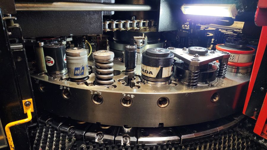 The Amada EMK M2 is the latest version of Amada’s popular “Electro-Mechanical” fully electric servo drive turret punch press. All EMK series machines feature a 33-Ton dual drive system and a full 5′ x 10′ table to process a full size sheet without the need for auto-repositioning. Also, the EMK is equipped with four auto-index stations including two of the industries largest 4 and 1/2 AI stations.