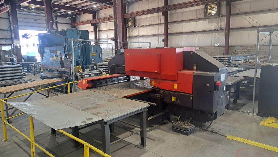 The Amada Pega 357 is a mechanical 33 ton turret punch press capable of  processing sheets up to 4′ x 12′ with one auto repositioning cycle. All of the Pega series machines are known for reliability and low maintenance costs. This Pega 357 features a hydraulic clutch and brake system, Fanuc based 04PC control and 50″ throat.  This Pega 357 has a 45 Station 4 Auto-Index Turret.